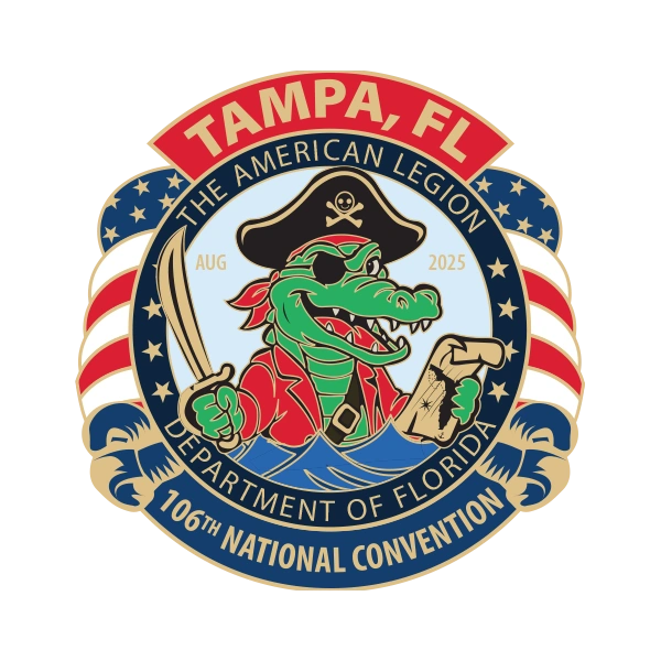 Celebrate the spirit of unity with the official 106th National Convention Pin, held in Tampa, Florida. Featuring a bold pirate-gator design and detailed enamel accents, this 1.25-inch lapel pin is finished in gold with nickel plating for lasting shine.