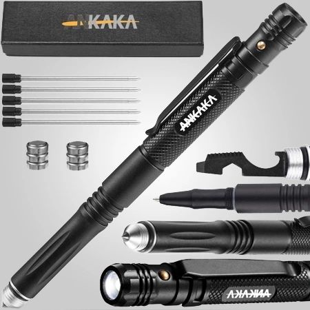 The ANKAKA Tactical Pen is a discreet yet powerful self-defense and survival tool designed for everyday carry. Made from rugged aircraft-grade aluminum, this pen is built to withstand extreme conditions while offering the functionality of a smooth-writing ballpoint pen. Its precision-threaded grip and thumb head provide a secure hold, allowing you to deliver maximum force when used as a defensive tool. Lightweight and balanced, it’s comfortable for extended writing sessions without sacrificing strength or stability. In addition to its writing capabilities, the pen features a hardened tip that doubles as an emergency glass breaker, along with a built-in bottle opener and LED flashlight cap. It comes packaged in a sleek gift/storage box and includes six ink refills, making it a practical and thoughtful gift for veterans, first responders, outdoor adventurers, or anyone who values preparedness and protection.