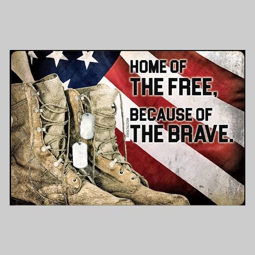 Honor those who serve with this powerful aluminum sign featuring a weathered pair of combat boots, military dog tags, and the American flag waving in the background. The bold message, “Home of the Free, Because of the Brave,” stands as a solemn reminder of the courage and sacrifice made by our nation’s heroes. With its striking red, white, and blue color palette, accented by earthy tones of brown and black, this horizontal landscape sign makes an impactful statement in any home, office, garage, or veteran’s space. Measuring 7.75 inches by 11.75 inches (19.7 cm x 29.8 cm), it’s made from durable aluminum, proudly manufactured in the U.S.A., and features pre-drilled holes for easy hanging indoors or out.