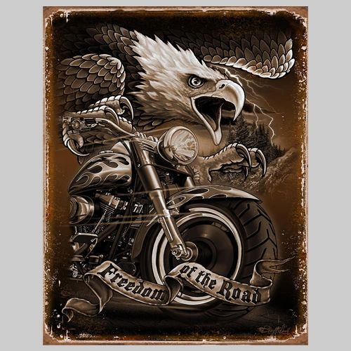 Unleash your inner road warrior with this electrifying “Freedom of the Road” tin sign. Dominated by a roaring bald eagle and a flame-detailed motorcycle in motion, this design captures the raw power and spirit of American independence. Set against a stormy mountain backdrop and wrapped in a tattered scroll bearing its bold motto, the sign radiates grit, freedom, and the thrill of the open highway. Rendered in a dramatic sepia tone with vintage-style distressing, this vertical 12.5 inch by 16 inch tin sign is the perfect tribute to bikers, patriots, and freedom-lovers alike. Proudly made in the U.S.A., it includes pre-drilled holes for effortless hanging in your garage, shop, or man cave.