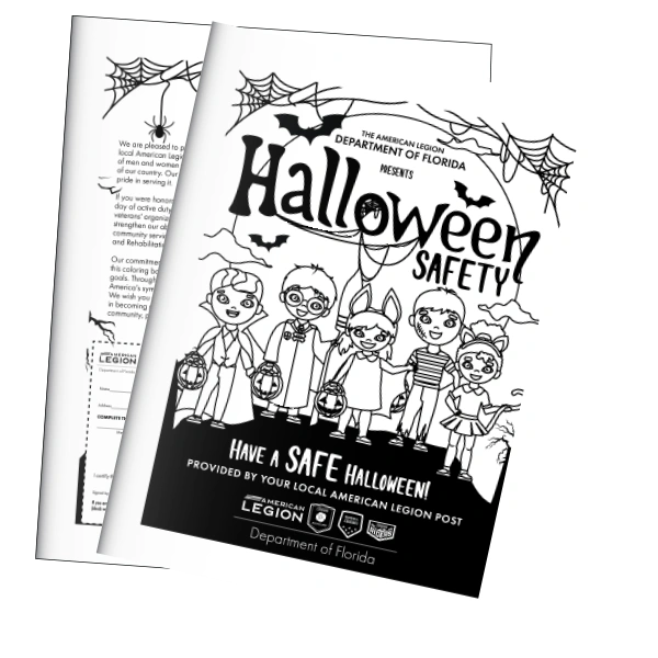 Promote safety and community awareness with The American Legion, Department of Florida Halloween Safety Coloring Book. Packed with fun activities and essential Halloween safety tips for kids and parents, it also includes information about The American Legion’s mission, a membership application, and space to add your post’s contact details. A perfect outreach tool for schools and daycare centers—submit your order by October 15th to ensure on-time delivery. Payment must accompany all orders. Posts, Auxiliary, and Detachments are all encouraged to participate!