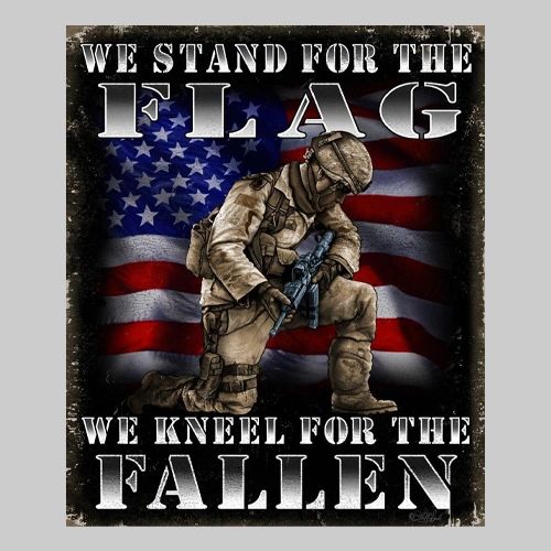 Honor the spirit of patriotism and sacrifice with this powerful tin sign featuring the solemn message: “We Stand for the Flag, We Kneel for the Fallen.” A battle-ready soldier kneels in silent tribute before a waving American flag, capturing a moment of deep respect for those who gave all in service to their country. The bold text and rugged design are enhanced by weathered textures and rich colors, making this sign a fitting tribute in any veteran’s space, memorial wall, home, or office. Printed in a vertical portrait layout, it measures 16 inches by 12.5 inches (40.64 cm x 31.75 cm) and is crafted from durable tin. Proudly made in the U.S.A., it comes pre-drilled for easy hanging.