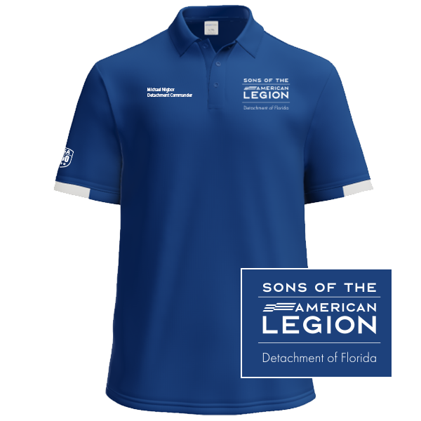 Celebrate Detachment Commander Michael Nigbor with the 2026–2027 Detachment Polo, featuring a sharp Club colorblock design and athletic fit. Show your SAL pride with the Sons of The American Legion, Department of Florida logo on the left chest, a USA 250 patch on the sleeve, and optional two-line personalization on the right chest (20 characters per line). Built on the Sport-Tek ST444, this polo offers moisture-wicking, odor-resistant performance with breathable mesh panels and recycled materials, all with a carbon-neutral footprint. Available in sizes Small through 4XL, this item is pre-order only, available in June, with free pickup at Department Convention or shipping to your home.