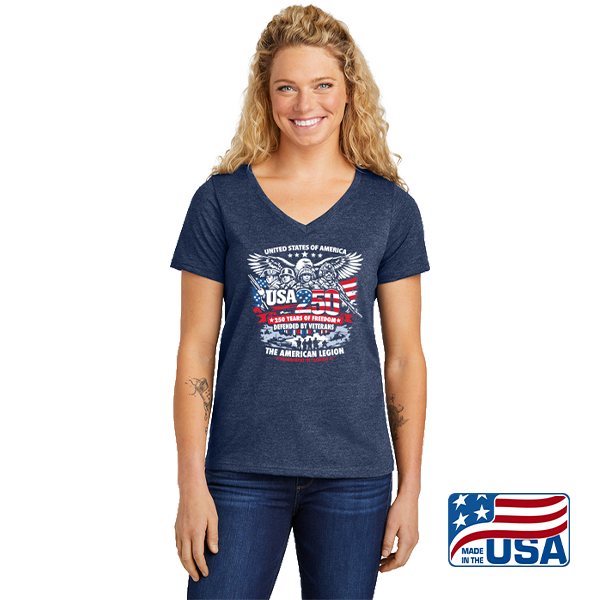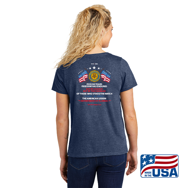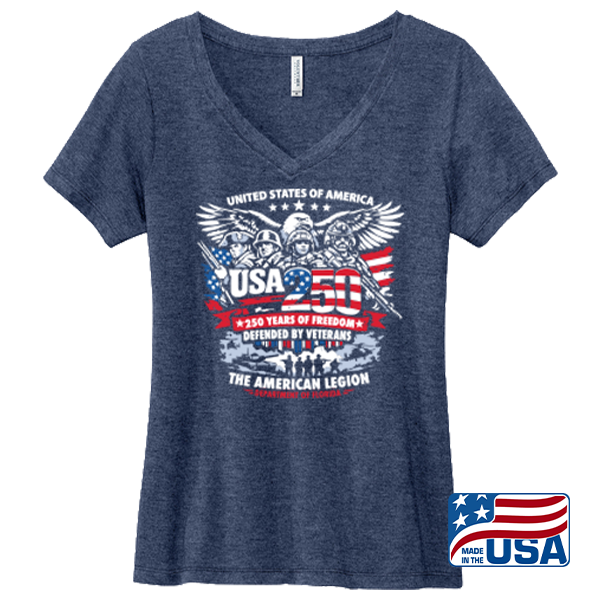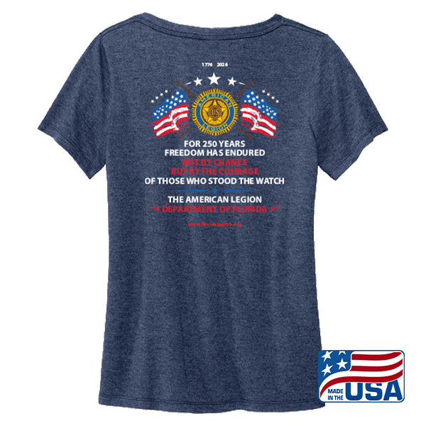 Celebrate 250 years of American freedom with a design that honors the legacy of those who stood the watch. The Department of Florida USA 250 Ladies V-Neck T-Shirt combines patriotic style with premium, USA-made craftsmanship—perfect for Legion family members and supporters who take pride in both country and quality.