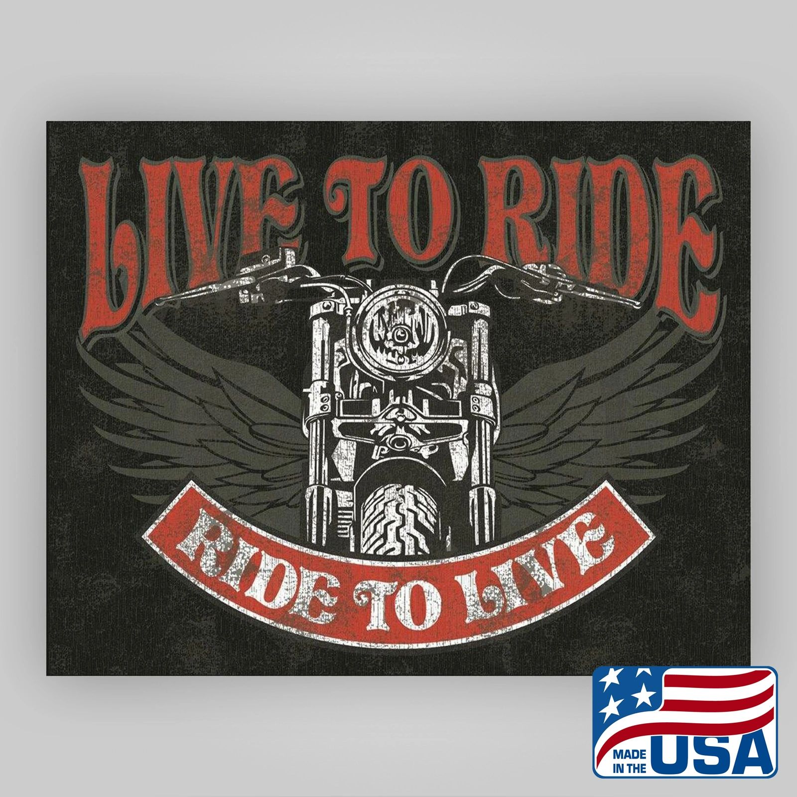 Ignite your passion for the open road with this bold “Live to Ride, Ride to Live” tin sign. Featuring a striking front-facing motorcycle framed by a set of stylized wings, this design captures the spirit of freedom and adventure that drives every true rider. With its distressed red and white lettering against a gritty black background, this sign blends attitude with classic biker wisdom. Measuring 16 inches by 12.5 inches (40.64 cm x 31.75 cm), the sign is printed in a horizontal landscape layout on durable tin. Proudly made in the U.S.A., it includes pre-drilled holes for quick and easy hanging in your garage, man cave, shop, or biker bar.